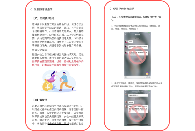 针对“杀猪盘”“零食托”“衣托”等高发骗局,除了通过内容风控系统的智能监测对用户信息、行为进行风控分级外,爱聊还在平台内私聊、广场、家族等多个场景,对相关交友行为进行风控安全提示。
